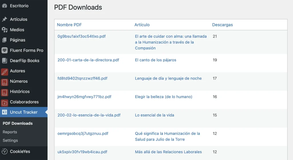 Cada artículo dispone de su versión en PDF descargable, de modo que el lector puede “guardarse” lo que le interesa igual que antes archivaba el ejemplar en papel. En este caso, desarrollamos un plugin específico para que el equipo pudiera consultar y exportar informes de descargas por artículo, país y rango de fechas, aportando visibilidad sobre el uso real de estos recursos sin tener que recurrir a sistemas externos.